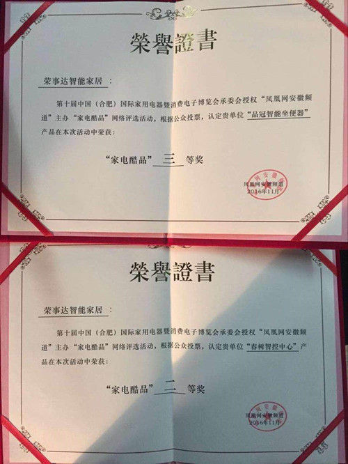荣事达春树智控中心、品冠智能坐便器以独特的创新实力和高品质产品解决方案在数千个产品中脱颖而出,成为了本次网络评选的一大赢家。不少网友表示,本次参选的荣事达春树智控系统在质量、设计、智能方面优势出众。作为荣事达电子电器集团进入“智能家居时代"的智控产品,“春树”秉承绿色环保理念,以树枝代替天线为创意,无线信号传输最远1600米,性能强悍。而品冠智能坐便器在质量、功能实用性等方面表现卓越,特别是接轨航天技术,采用智能气压调节技术,12大创新智慧系统,32项智慧设计,均为行业首创,针对中国国情的独特设计,在产品功能、服务和质量等方面完全不亚于日系品牌。这两款产品用创新智能体验和高品质征服了广大网友的心!