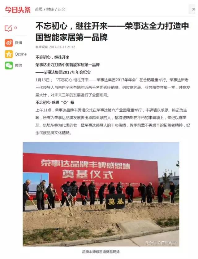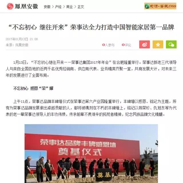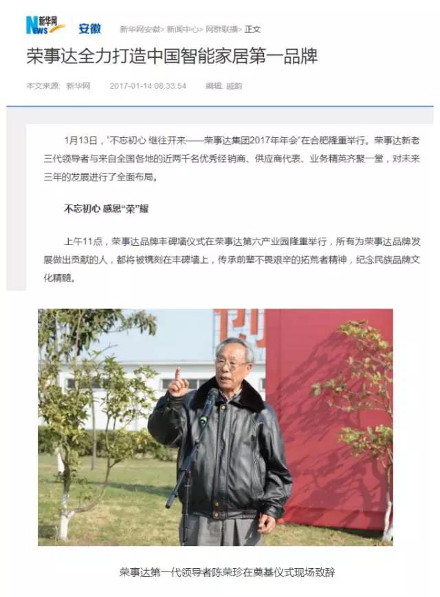 昨日,“不忘初心 继往开来——荣事达集团2017年年会”在合肥隆重举行。荣事达新老三代领导者与来自全国各地的近两千名优秀经销商、供应商代表、业务精英齐聚一堂。大场面、大卡司、大阵容......吸引了新华网,凤凰安徽,今日头条等各大新闻媒体的广泛关注和集中报道!