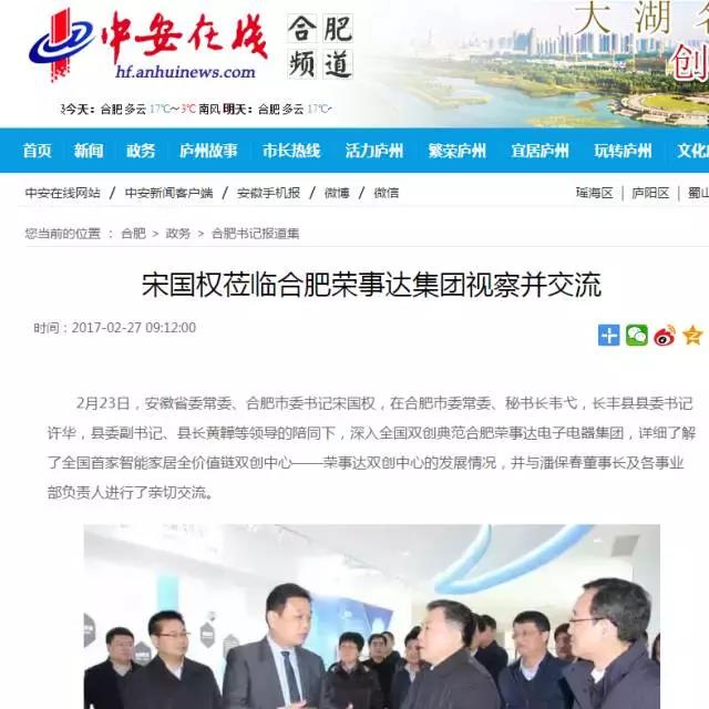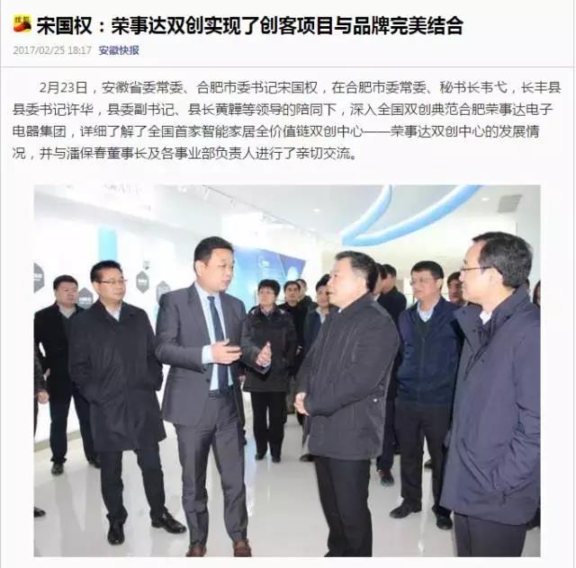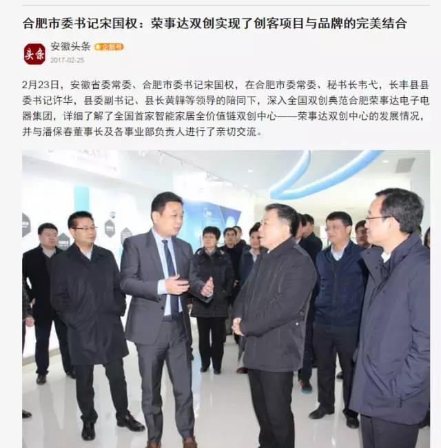 近日,安徽省委常委、合肥市委书记宋国权,在合肥市委常委、秘书长韦弋,长丰县县委书记许华,县委副书记、县长黄韡等领导的陪同下,深入全国双创典范合肥荣事达电子电器集团,详细了解了全国首家智能家居全价值链双创中心——荣事达双创中心的发展情况,并与潘保春董事长及各事业部负责人进行了亲切交流。