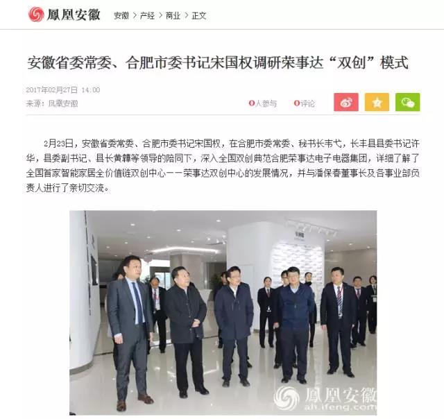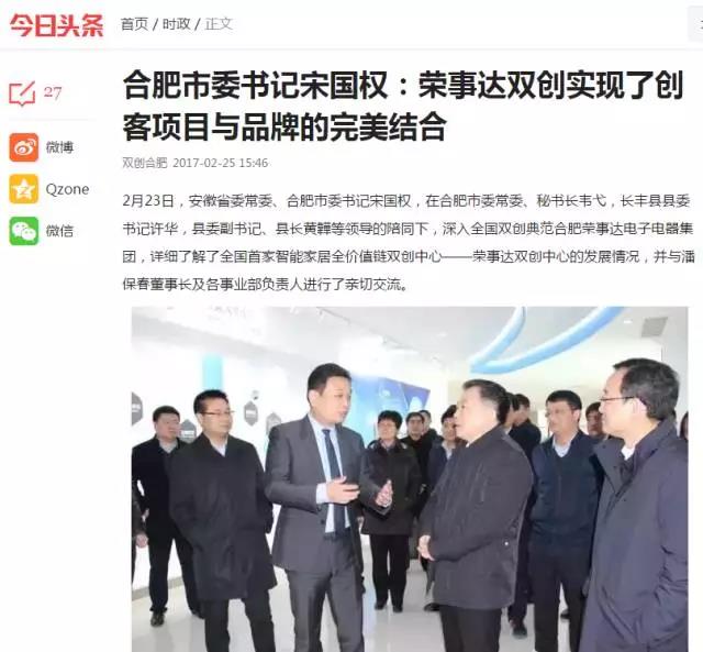2月23日,安徽省委常委、合肥市委书记宋国权,在合肥市委常委、秘书长韦弋,长丰县县委书记许华,县委副书记、县长黄韡等领导的陪同下,深入全国双创典范合肥荣事达电子电器集团,详细了解了全国首家智能家居全价值链双创中心——荣事达双创中心的发展情况,并与潘保春董事长及各事业部负责人进行了亲切交流。
