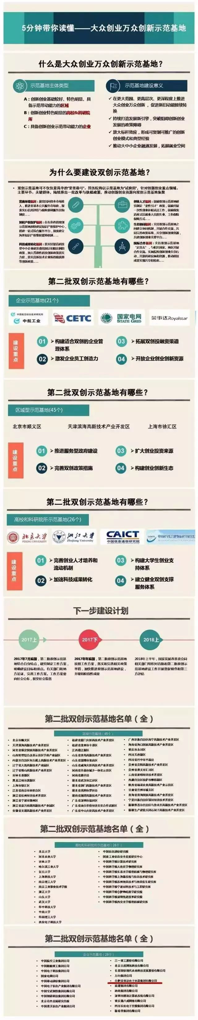 《意见》明确了第二批共92个双创示范基地,包括北京市顺义区等45个区域示范基地,北京大学、中国科学院西安光学精密机械研究所等26个高校和科研院所示范基地,合肥荣事达电子电器集团有限公司等21个企业示范基地。其中,企业示范基地的建设重点为:构建适合双创的企业管理体系;激发企业员工创造力;拓宽双创投融资渠道;开放企业创新创业资源。