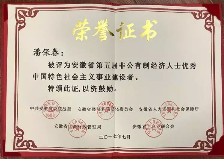 7月31日至8月1日,安徽省工商联第十一次代表大会暨安徽省第五届优秀中国特色社会主义事业建设者表彰大会在合肥召开。会前,安徽省委书记李锦斌,省委副书记、省长李国英亲切会见与会代表。安徽省委副书记信长星出席会议并讲话。合肥荣事达电子电器集团董事长潘保春当选安徽省工商联副主席,并荣获“安徽省第五届优秀中国特色社会主义事业建设者”称号。