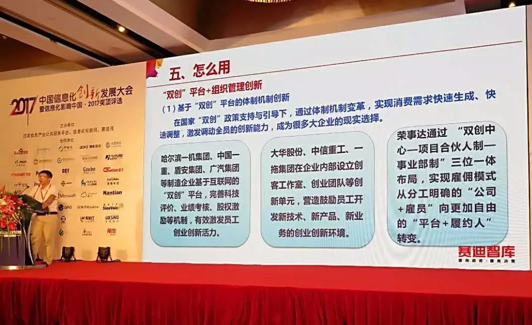 会议现场,中国电子信息产业发展研究院信息化研究中心主任、中国制造企业双创发展联盟秘书长杨春立在讲话中,对荣事达“双创中心—合伙人—事业部制”三位一体的双创模式表示高度评价。随后,荣事达代表在报告中详细分析了当代企业实现信息化、智能化转型的必要性与有效途径,并介绍了荣事达在实现企业转型发展中的先进经验,得到了与会人员的共鸣与好评。