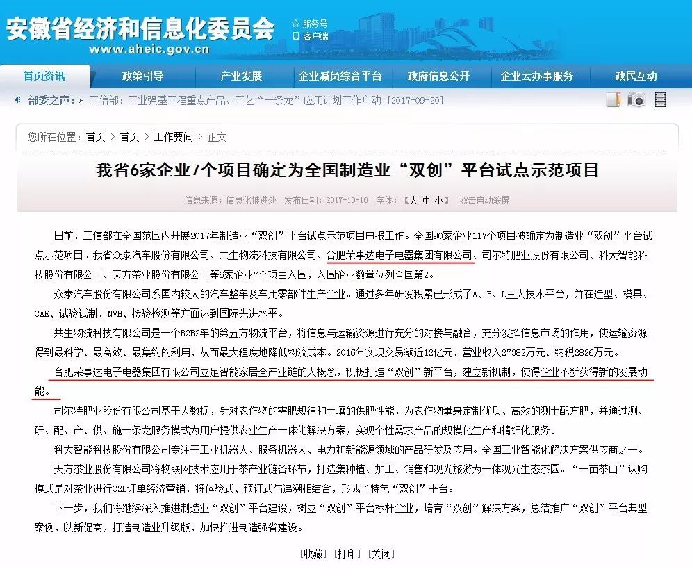 日前,工信部在全国范围内开展2017年制造业“双创”平台试点示范项目申报工作,安徽省6家企业7个项目被确定为制造业“双创”平台试点示范项目。其中,合肥荣事达电子电器集团有限公司成功入围。