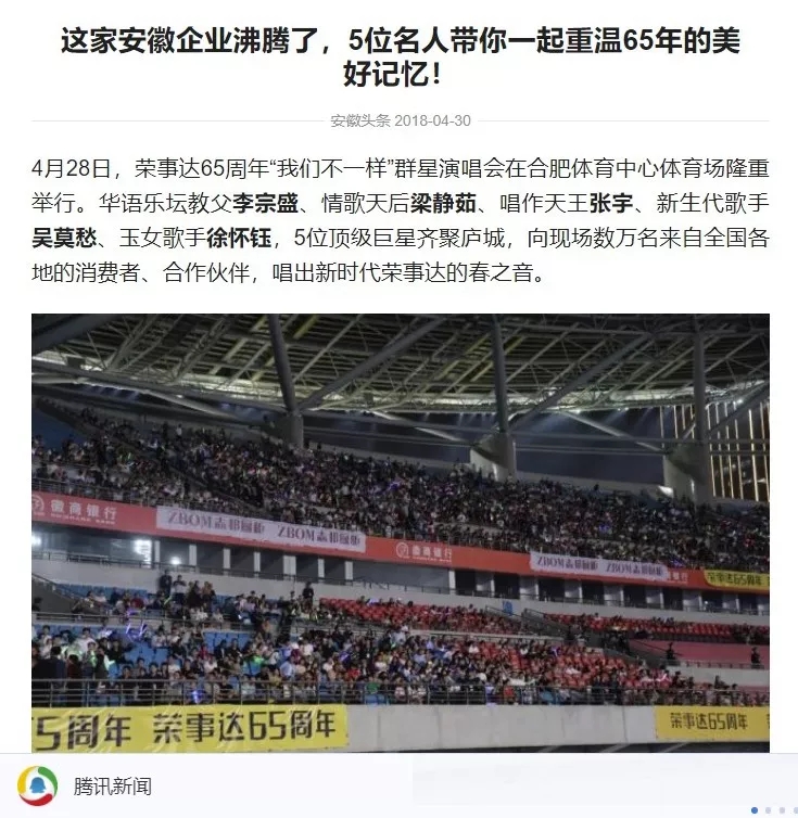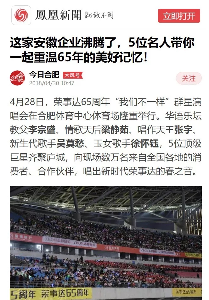 荣事达65周年“我们不一样”群星演唱会在合肥体育中心盛大开演。李宗盛、梁静茹、张宇、吴莫愁、徐怀钰等实力明星倾情献唱,在这个伟大的新时代,再次唱响了民族老品牌荣事达的最强音。四万人体育场座无虚席,共同见证荣事达集团65周年盛大庆典。