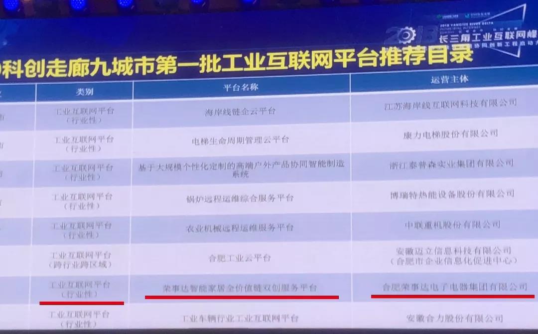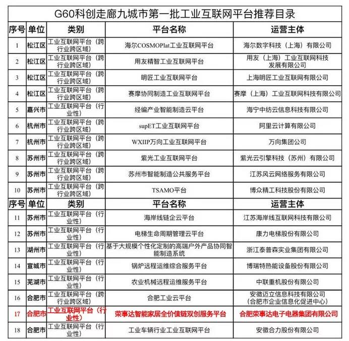 大会期间,《G60科创走廊九城市第一批工业互联网平台和专业服务机构推荐目录》发布。合肥荣事达电子电器集团有限公司独立打造并运营的“荣事达智能家居全价值链双创服务平台”荣登榜单,成为行业性工业互联网平台。