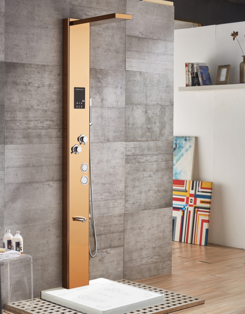 产品优势: 不锈钢黄金比例精制 麦克风SPA手持增压花洒 全铜镜面电镀阀门 LED电容触摸屏 水温在35°-55°之间 随意调节 负离子净化空气 足疗养身节能盘;多功能出水 产品名称 触摸淋浴屏 产品型号 RSD-8524D 装箱数量 1套 规格尺寸 主体:2000x220