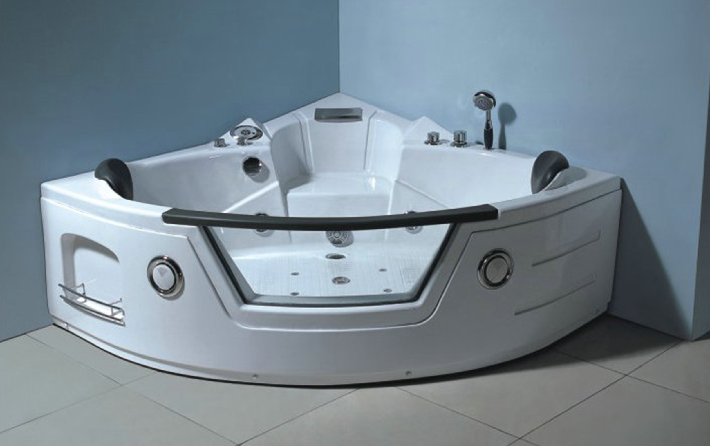双人按摩浴缸 恒温按摩功能软靠枕头 手持淋浴花洒复合 陶瓷白亚克力板材 带瀑布流水 有收音机功能 产品名称 按摩浴缸 产品型号 RSD-8902 装箱数量 1套 规格尺寸 主体:1500*1500*650